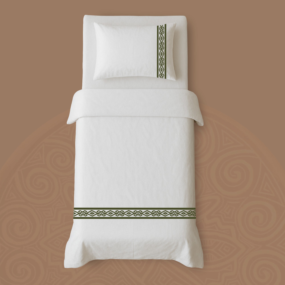 O kit traz a ancestralidade da arte marajoara, aplicada em tecido 100% algodão, 180 fios – fresco, resistente e de fácil cuidado.