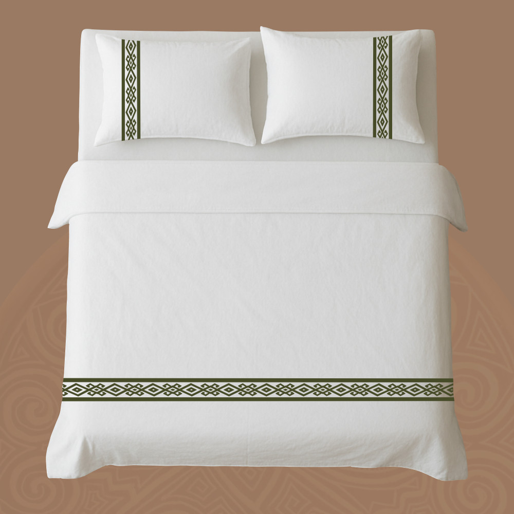 O kit traz a ancestralidade da arte marajoara, aplicada em tecido 100% algodão, 180 fios – fresco, resistente e de fácil cuidado.